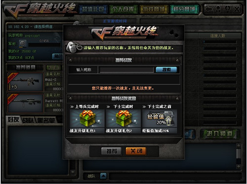 视频首先着重介绍了为新玩家打造的战友系统,每个新玩家进入游戏,可推荐一名老玩家为自己的战友,推荐成功后,新玩家可以获得一定的道具奖励及经验加成,更快的成长,而老玩家则会获得经验以及FP点数,用于购买稀有道具。当新玩家等级达到少尉后,双方的战友关系就会自动结束。同时视频还向我们展示了FP点的稀有道具猎狐者、斯沃特精英以及蓝水晶系列武器。
