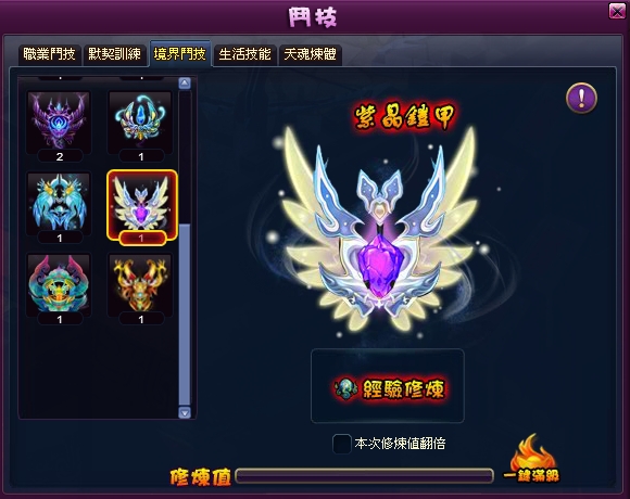 全新开放的境界斗技分别为:天冥修罗、紫晶铠甲、大地罡炎和龙凰古甲,玩家只要达到斗尊境界便能开启前两种,而后面两种要到月尊境界才能习得。天冥修罗和大地罡炎为主动攻击技能,前者可以在攻击时有一定机率将目标异火的物理和斗气攻击归零一小段时间,同时还可以增加人物的攻击力;后者则是可以在攻击时有一定机率将目标异火的伤害加深归零,同样也可以增加人物的攻击力。而大地罡炎及龙凰古甲则是对抗这两招的被动技,能够机率性抵消这两招的负面效果并增加人物的防御力。