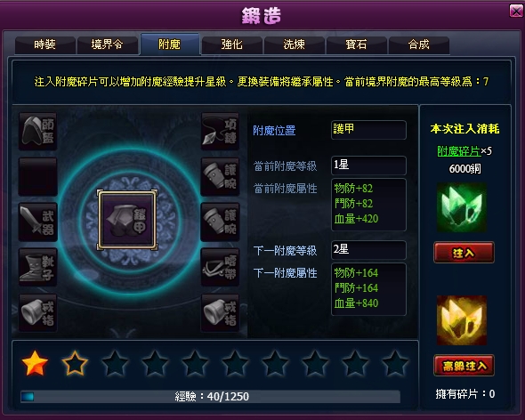 玩家只要达到斗皇境界就能开启此系统,附魔系统可以对身上的装备部位进行强化,也就是说玩家的强化是可以保留的,就算得到更高等级的装备换上,也能够得到此部位的附魔能力加乘,让玩家的心血不会因为换装就白费。而想要帮各部位附魔,就需要到风雷山脉及焚炎谷收集打怪会掉落的附魔碎片来增加附魔的能量,但这些地图的怪可都不好惹,再加上四周虎视眈眈的敌国玩家,势必会产生一场场刺激的争夺战。