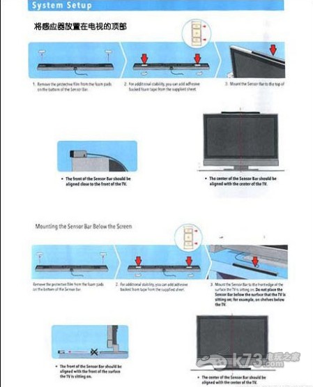 感应条最好是放在显示器上方(如果不好放可以用双面胶黏住),注意看。下面图,也可以放屏幕下方,放下方要注意,不要有东西挡住红外光,手柄和感应条距离要在1米外。使用距离2-3米最佳。