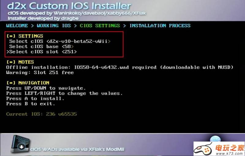 重复以上步骤分别基于IOS57在250位置、基于IOS58在251位置破解安装对应的cIOS(d2x-v10-beta52-vWii)