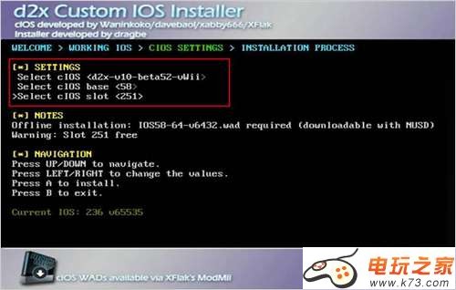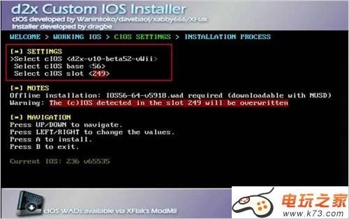 在软件界面SETTINGS选项中,选择安装cIOS(Select cIOS ),基于IOS56安装(Select cIOS base <56> ),安装槽位249 (Select cIOS slot <249>)如果选定的位置已经安装过cIOS则会标红提示将覆盖,确定操作无误覆盖即可。按A确定安装。 安装结束后按A继续。
