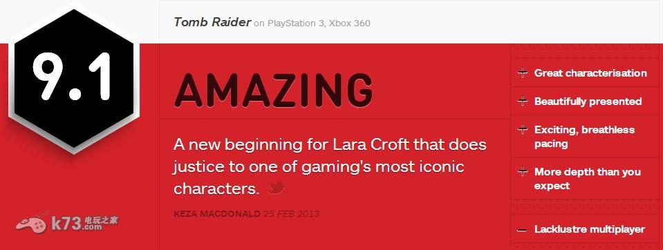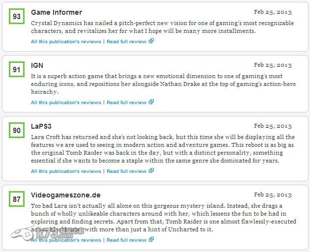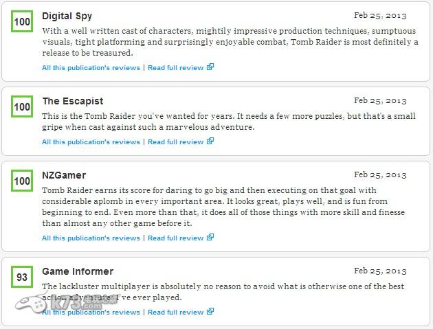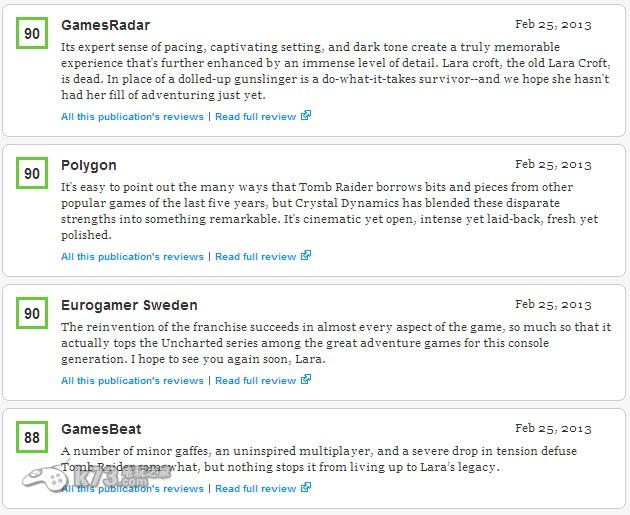 接近SE动作大作《古墓丽影9》在欧美地区的发售,国外知名游戏媒体如IGN、Gamespot等网站纷纷对本作进行了详细的评测,而众多游戏媒体对于本作的评分也极为称赞,让我们来看看具体的评分吧!