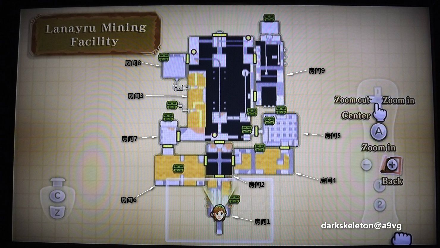 房间1:用飞甲虫夹高台上的炸弹炸倒西北角的门,过去拉下开关。进入房间2 房间2:把北面西侧的箱子推到高台边,爬上去进入房间3. 房间3:炸掉东面平台上的木箱子,跳过去,宝箱里有小钥匙。回房间2从东面的门进入房间4. 房间4:爬到南面平台上,用飞甲虫夹入口上面的炸弹炸掉西南角高台上的木箱,爬上高台,踩下机关,房间中间顶上出现了时空石,站在原地用飞甲虫撞它。 从中间的履带条上冲到对面,然后右手上高台。再从最东面的履带条冲上去,干掉机器人(砍段身体后直接戳眼睛)。进入房间5。 房间5:从大箱子上跳到北面,上高台打开宝箱拿到吹风筒(Gust Bellows),可以吹掉地上的砂垢。(PS:刺猬鱼(Froak)不出刺的形态下,碰到他们会爆炸,炸弹不足的话,可以利用它们开路。)回到房间2. 房间2:用吹风筒吹掉箱子周围的砂垢,出现机关。把箱子推上机关,然后从西面门进入房间6。 房间6:启动东南角砂垢里的时空石。用吹风筒吹轨道移动平台上的叶子,可以控制它们移动。吹动南面门上面的风车开门,进入后把最西面的移动平台吹到轨道中间。(PS:导弹飞行器(Sentrobe)的导弹可以用盾牌挡回去。)过去后爬上高台,吹动风车打开铁栅栏,进入房间7。 房间7:把箱子拉到中间上高台。在门外面把里面的砂垢吹掉,出现时空石,用弹弓攻击它启动。干掉敌人后开门,宝箱里是迷宫地图。进入房间3。 房间3:打开地图,看到流沙里有金黄色的线,顺着线走就不会陷下去。因为不能做标记,所以最好找个参照物。比如对面的石头,中间的平台等等。从地洞爬到右上角的房间8。 房间8:地上有很大面积的砂垢,吹掉可以看到地刺的位置。西侧中间的地方有机关,踩下后上楼梯进入房间3西北角。 房间3:矿车里藏有时空石,用剑戳一下下面的小孔可以启动矿车。跟着矿车走,到了中间,吹动门上的风车,开门后继续跟着矿车走,干掉挡在轨道中间的机器人。 矿车走到头以后,同样方法开动东面的矿车。在矿车行驶的路上,吹动东侧墙壁上的风车,开门进入房间9。 房间9:从东面蔓藤爬到右侧上高台(注意阴影的地方会喷气)。南面炸倒带篮框的石门,跳过去,启动砂垢里的时空石。 拉下东面中间位置的开关,从移动平台到对面。炸倒石门看见里面的图案,同时把中间的移动平台吹到最南边。通过移动平台到达北面,换乘东面的移动平台。 炸倒东面的石门,然后按照对面相对应的顺序触发机关。先北边,再南边,最后中间。进北面的门搞定看门的敌人后,拿到古代的回路(Ancient Circuit)。回房间3 房间3:启动矿车后,从旁边跳上移动平台跟着一起过去。调整好方向插入钥匙,进入BOSS房间。