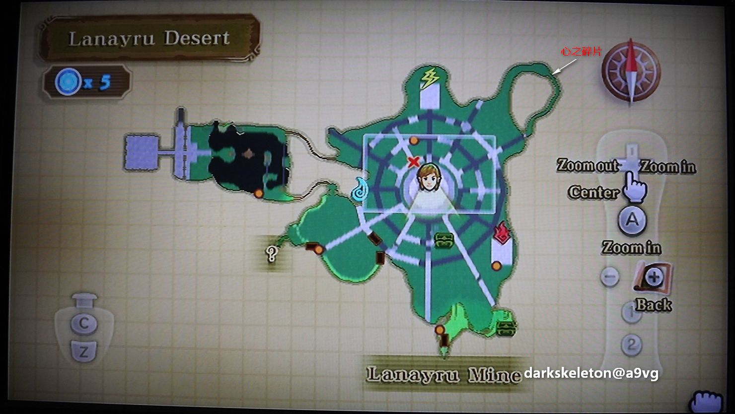 入口处炸开右边(东侧)的岩石出现时空石。 走到中间区域有三个笼子的地方,先从南面高台的断裂处爬上去,然后跳到右边的那个笼子上面。把炸弹扔进中间那个顶上面有洞的笼子,炸出时空石,再扔一个炸弹进去或者用弹弓都能启动时空石。干掉两个带电棒的怪后,所有的笼子都会打开。跟笼子里的古代机器人对话,他会把你的飞甲虫升级成带钳子的飞甲虫(Hook Beetle),之后飞甲虫可以夹带东西。 用飞甲虫夹炸弹炸倒西边所有的石门,通过后看到西边沙漠里有两个巨殻蜗牛,杀死它们后,他们的壳会继续存留一会,并且可以爬上去。把壳当作恢复体力的中转处,就可以通过一些平台距离较远的沙漠。西南面平台上有女神方块11。 通过两片沙漠,穿过山洞来到时之神殿前面。启动近处的时空石,乘矿车过桥后,再用飞甲虫把炸弹从西面半截树干的顶上丢进去,启动了另外一块时空石。用飞甲虫触发洞里的机关,打开北面栅栏。 乘矿车过桥,炸开北面高台上的岩石出现时空石,挡在矿车前的古代机器人离开后,再攻击矿车路线对面的时空石,然后乘矿车通过。矿车行进过程中,用天空斩打开路上的女神方块12。 穿过山洞来到一片大沙漠,打开地图,灰色轨迹的地方是不会陷下去的地方,白色的是高台,绿色的地方是会陷下去的。移动之前先看好,提前在地图上做好路线标记的话,会容易一些。地图上红叉标记处是带有钟面的强力发电机,打开三个小发电机(generator)的话,就可以启动它。 1.西面9点钟位置,炸开墙上的裂缝,启动时空石。炸倒中间的门,找到发电机。剑插进去转动后,启动发电机。 2.东面4点钟位置进入电厂,利用流沙和蜗牛壳,先到房间最北面,再从西面爬上高台,把箱子推下去。然后启动房间正中央岩石里的时空石。用飞甲虫把地上带电的虫运到北面,再过去把电虫放进电力装置。进门启动发电机。 3.北面12点钟位置,炸开墙上裂缝进入电厂。启动中间岩石里的时空石,把地上的电虫,丢进北面的电力装置。进门启动发电机。 回到强力发电机那里,启动旁边的时空石后,插入剑转动表盘。刻度分别对应各图案所在位置的时刻点。首先9点,然后4点,最后12点。启动后,沙漠正中央出现拉奈鲁炼石场。
