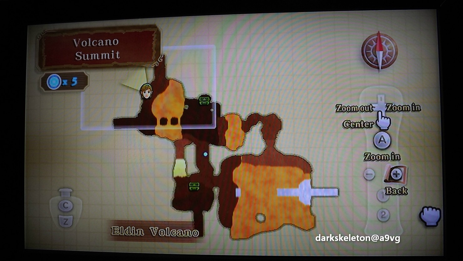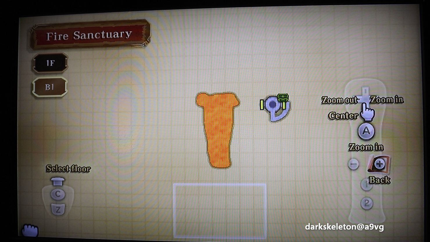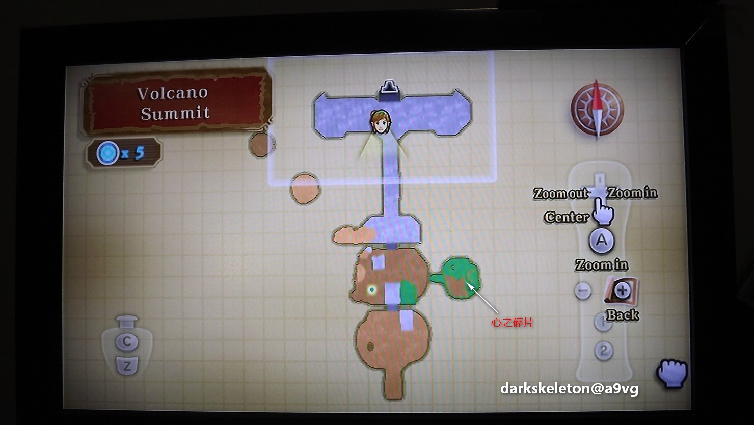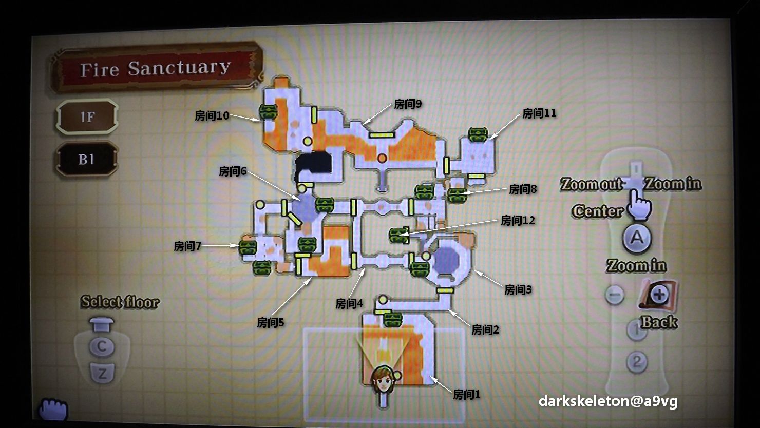 房间1:攻击树上的果子,果汁掉下来会在岩浆上形成一个短时间的平台。来到北面,跳上果子生成的平台,顺岩浆而下,来到东面登陆,高台上拿到小钥匙。men口遇到莫古玛老大,他告诉你,遇到两个雕像时,跳向睡着的那个雕像里。开门后,穿过房间2来到房间3。 房间3:站在中间的石块上,岩浆手臂会把你托起来。绕到西面平台上,进入房间4。 房间4:干掉敌人后进入房间5。 房间5:用飞甲虫夹住西边洞里面的炸弹,炸掉北面堵住龙嘴的岩石。然后站在果汁生成的平台到达西面。从北门进入房间6。 房间6:吹风筒可以清除地上的岩浆积块,东北角宝箱拿到小钥匙。回房间5,从西门进入房间7。 房间7:用剑突刺可以插上果子,站在高台上,扔到青蛙的嘴里。进门来到房间6东北面。 房间6:爬上高台插上一个果子,然后站在石块上,把熔岩手臂引出来,石块升起的一刹那跳下去,对着伸出来的手臂猛砍。干掉两个熔岩手臂后,岩浆退去。来到南面,拉下开关把莫古玛放下来。他会给你一双莫古玛手套(Mogma Mitts)。用手套钻进旁边的洞里,爬过地洞,进入北面的屋子。 清除熔岩积块,钻到洞里推动机关。出去后从东面进入房间4 房间4:利用钩爪到东北面,进入房间8。 房间8:东南边挖洞钻进去,推动两个机关后出来。插个果子出来扔到青蛙嘴里。到北面房间拉下机关放下莫古玛,他会给你迷宫地图。另外一个莫古玛告诉你,这个房间有个假墙。打开地图看一下这个房间和阴影连接处的位置(东北面),用炸弹炸开。从地洞里钻进去,另一个房间钻出来(里面的大虫打屁股就可以了)。宝箱里拿到小钥匙。从房间6的北面进入房间9。 房间9:打下果子,从生成的平台上跳到对面。西北面进入房间10。 房间10:最西面的地洞钻进去,抓住里面的莫古玛后,他会给你一个心之碎片,并且打开铁门。打下中间的果子,跳过平台来到房间东北部。从鸟雕像旁的地洞钻进去后,炸开岩石,这时候岩浆会蔓延过来,迅速从洞里爬出来。回到房间9. 房间9:乘果子生产的平台来到中南部,站在高台上看下面的石像。一个是睁着眼睛的,一个是闭着眼睛的。从闭着眼睛的那边勇敢地跳下去。快到底的时候,嘴部会出现一个平台,落上去来到B1。 B1:打倒敌人后开门,进去爬到顶部进入房间11。 房间11:进入地洞,按照雕像翅膀从少到多的顺序触发相应的机关。按Z键可以在地下看到地面的情况。全部点亮后,大虫被放出来。干掉它以后,出洞拿到神秘水晶(Mysterious Crystals)。回房间9,插钥匙进入BOSS房间。