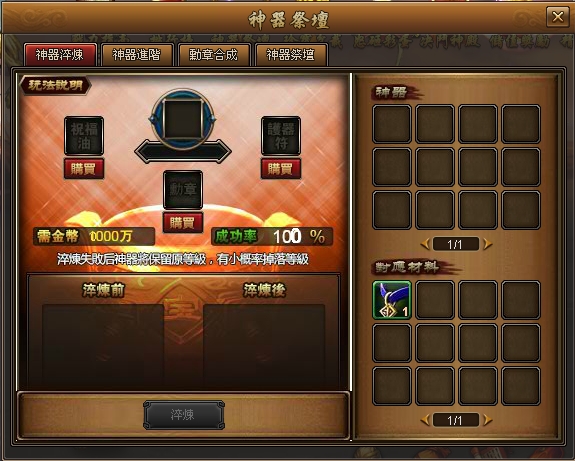 可在神器祭坛内进行神器淬炼、神器进阶、勋章合成等操作。