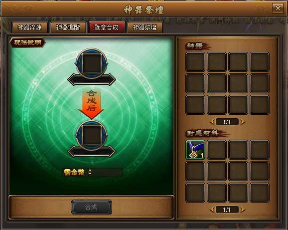 玩家可以在【勋章合成】介面将低级的勋章合成为高级的勋章,只需要消耗一定的金币。