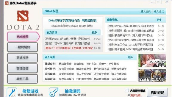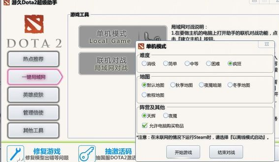 进入游戏后会跳出万恶的激活码界面,这时候不用理睬,直接切换到桌面(PS:是切换不是关闭游戏),然后点击游久网的DOTA2超级助手(DOTA2超级助手需要到游久网下载,直接百度搜索下有了),选择一键局域网,点击下面的开始游戏。(PS:注意确保刚才打开的DOTA2运行 就是画面还在处在上图的绑定完美电竞的界面)。