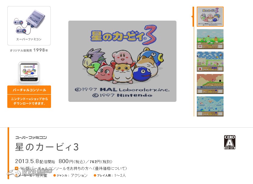 官方将会配信sfc经典的《星之卡比3》《カービィのきらきらきっず》《カービィボウル》三款星之卡比作品,官方还实行了一个促销活动,凡是一次性购买任意两款卡比作品的玩家都能免费配信到第三款作品,也就是说你可以以1600日元的价格买到这三款卡比游戏,而Wii用户还可以每款便宜150日元。