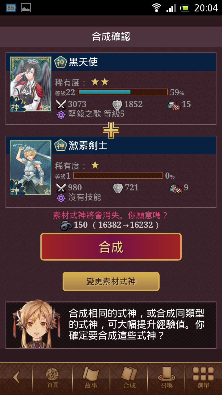 另外,也可以使用一般的式神做为素材,只是所能获得的经验值会比勾玉少上许多。做为素材的式神或勾玉使用过后就会消失,因此在合成前一定要特别小心不要选择错误了。