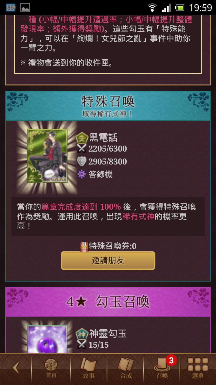进行「特殊召唤」有机会可以召唤出三星以上的较佳式神,只是特殊召唤必须使用「特殊召唤券」,取得的管道较少,除了新手一开始创角时输入其他玩家的邀请码可以获得之外,待解完故事模式的所有篇章后也可以取得一张做为奖励,特殊召唤出的式神较有培养强化的价值。