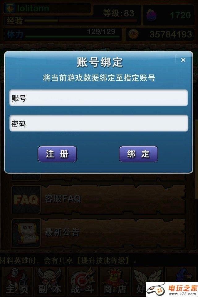 4、打开“攻略”按钮,找到“帐号绑定”并打开,先注册一个帐号(电子邮件),然后登陆该帐号,并选择绑定;