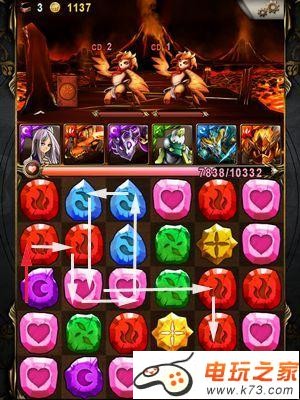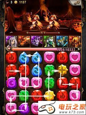 L 型排列的珠子容易消除,也最容易看出高COMBO 的路径,图一里面就有三个L 型,从L 型周围的珠子开始最能省时间,新手也不要太贪心,三个COMBO 伤害也有多个50% ,在同一个区域来回转珠子就怕碰到已经排好的珠子,当下一犹豫时间到了可能就只消一次,如果你的手脚够快,绕图二的路线就可以得到六个COMBO 。