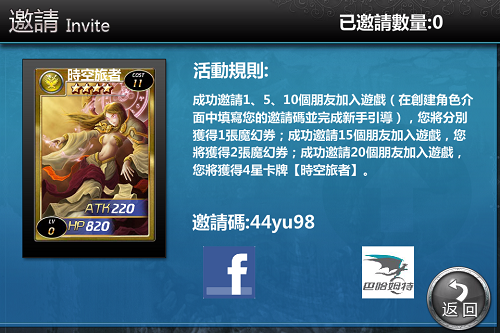 因为当你的邀请码"被使用20次"后,将可以得到5张魔幻券和4星卡牌[时空旅者]