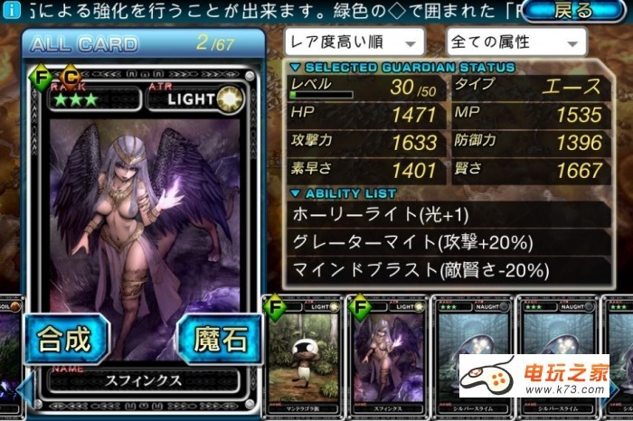 强化有两个模式, 一个是用吃掉低级卡片(1-2星), 第二种是用魔石强化...魔石打到的暂且都留着, 因为初期没有强力怪兽...吃卡片也有讲究, 像3星的金属史莱姆没有任何攻击力...但是可以稳定让你的卡片升一级...无论是几星卡...所以金属史莱姆需要一个一个的吃...复数吃卡片, 一次最多可以吃16张, 吃同属性的怪兽经验会涨得多一点...好了, 其实这游戏到后期肯定是打竞技场冲RANKING, 这里告诉大家一个初期没有什么强力卡得时候冲RANKING战术...把你最牛逼的卡片都放在最后面, 比如