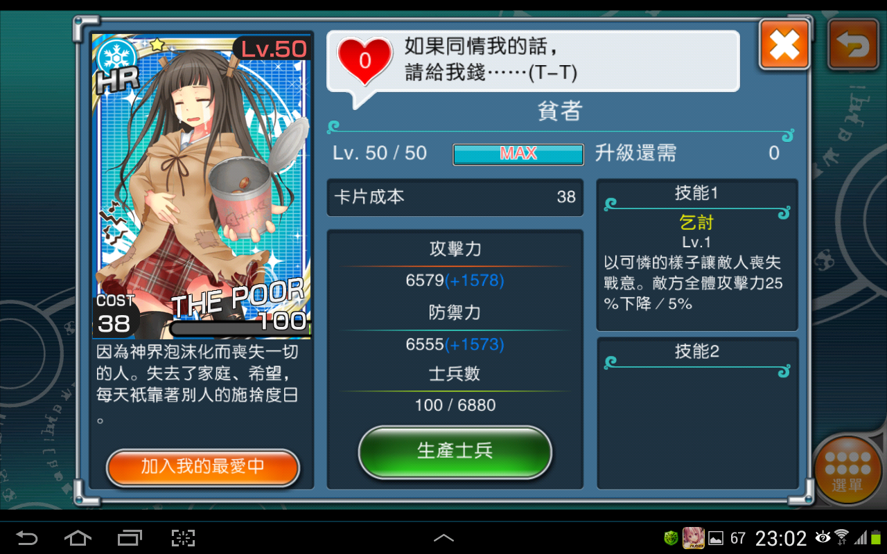 这种卡,每张卡片一场最多放3次技能,并不会无限制一直放。贫者、达尔芬娜比半精灵坦很多,血量跟防御力都有差,我个人是不会去衝半精灵的防,当作过度卡使用。SR指挥官由於属於SR阶级,省略说明。有一些N阶卡片也有降攻技能,由於N卡衝技能比较便宜,所以可以衝满技当过度卡。这些N卡分别是兽王、巫女,而侦察兵属於开场型,还是不要用比较好。