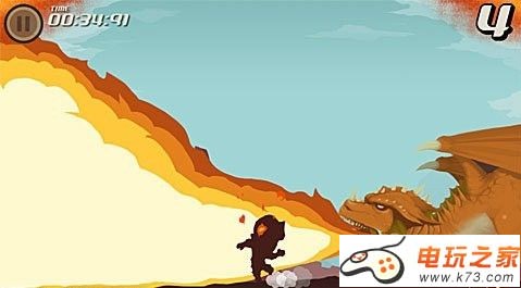一开始就遇到了火龙,火龙在右边吐火,只要一吐火,点击屏幕,骑士会使出盾牌。这一关的目的是走向火龙身边。而火龙的吐火规律,大家观察火龙的抬头动作便可知晓,火龙一旦抬头,立即按住屏幕不放,如果等待火龙趴下吐火在举盾牌怕会时间不够,建议抬头就举盾牌。