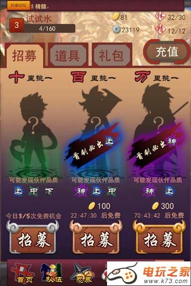 招募弟子,有三种收徒模式,分别为十里挑一、百里挑一、万里挑一,每次可随机刷新出一个忍者。