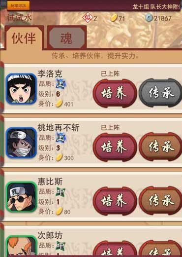《忍将》是一款拥有着清新的画面、众多的人人物角色挑选、华丽的战斗、还有着忍界奇遇等优点的手机网络游戏,火影迷的必玩游戏,这里就和玩家们一起说明在游戏中的伙伴及队伍系统说明。