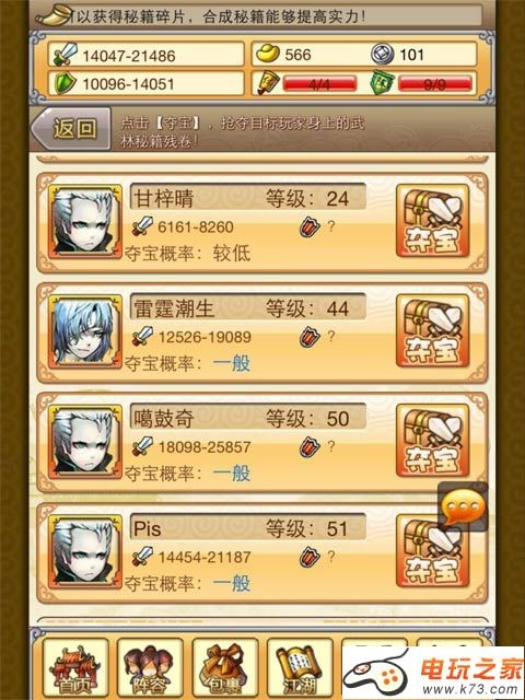 4、玩家缺少哪个秘籍碎片,点击“去抢夺”就会搜索出有此残卷的玩家供你去夺宝。