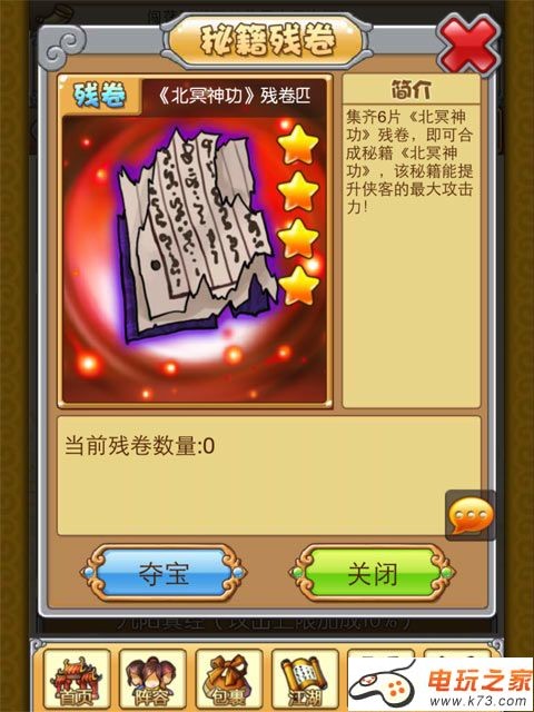 5、秘籍残卷通过合成成为秘籍,不同的秘籍作用是不同的,有攻击上限加成的残卷,攻击下限加成的残卷,防御上限加成的残卷,防御下限加成的残卷,还有打出最大攻击概率的残卷和打出最小攻击概率的残卷,玩家根据自身情况进行夺宝。