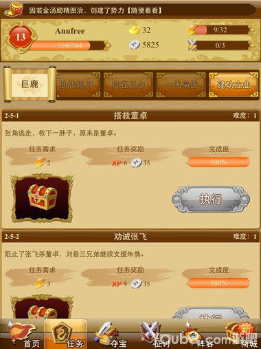 【任务】点击任务进入任务界面,每次完成任务都会消耗相应的体力,完成任务获得相应的奖励。奖励有宝箱、经验、银币、再接再厉四种,游戏中最基础的系统,我们可以理解场网游中的“打怪升级”的地方。