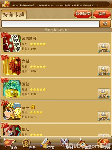 【卡牌】点击卡牌进入卡牌界面,这一界里包含了你所有的卡牌,包括武将、装备、宝物等也可以通过改变排列顺序来查看,卡牌显示上限为一千张。