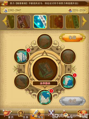 【夺宝】点击夺宝进入夺宝界面,点击不同的宝物可以查看宝物需要的碎片,缺少的碎片可以通过夺宝获得。点击缺少的宝物碎片,选择一个拥有此宝物碎片的玩家,成功夺宝之后宝物碎片则会显示,不成功可再进行抢夺。