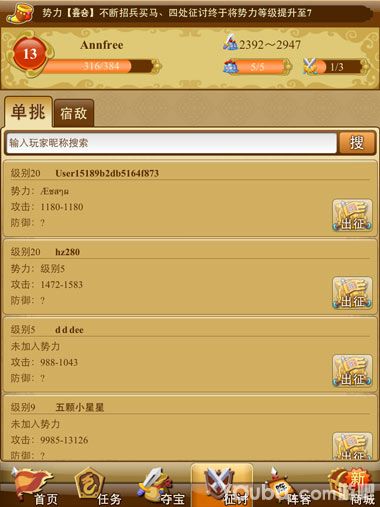 【征讨】点击征讨进入征讨界面,征讨页面分为两部分。一部分显示和你等级相近的玩家列表,一部分是宿敌也就是抢夺过你的玩家列表,你可以以牙还牙夺回宝物。