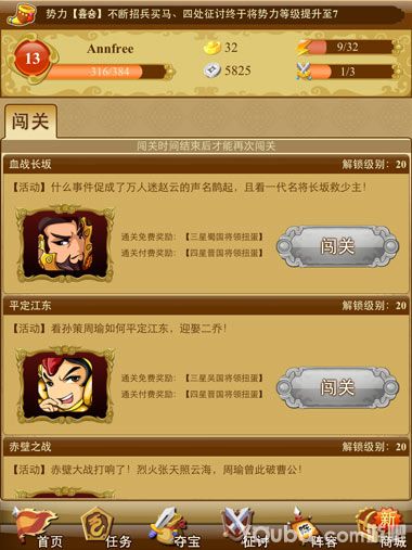 【闯关】20级开启,点击闯关进入闯关界面,闯关俗称副本。选择你要进行哪个副本,根据冷却时间来完成副本,在副本里会获得相应的奖励,当然奖励会比在任务中获得的丰富的多。