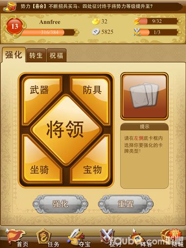 【强化】点击强化进入强化页面,强化页面包含了强化和转生。强化的作用是提高卡牌的属性,可以是武将、武器、防具和宝物等。转生的作用是当卡牌达到满级后可以进行转生,提高属性或者得到克制技能。
