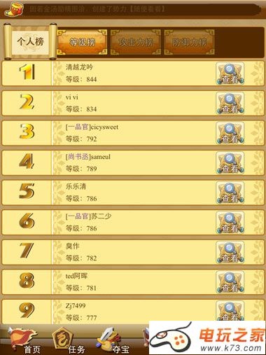 【排行】点击排行进入排行界面,在这里玩家可以看到个人目前实力在游戏中的排行,和势力的排行榜。