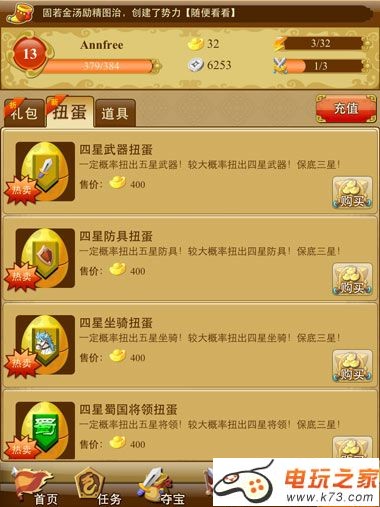 【商城】消费的地方,所有势力的扭蛋、装备扭蛋,各种礼包,都可以通过元宝购买。酒馆会随机出现一些3星武将和3星装备。每间隔24小时酒馆会刷新一次。