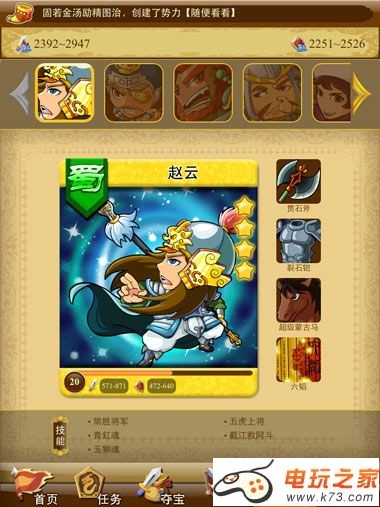 【阵容】点击阵容进入阵容界面,这里你可以看到目前上阵的武将装备等信息,并可以直接更换或是排序。