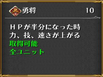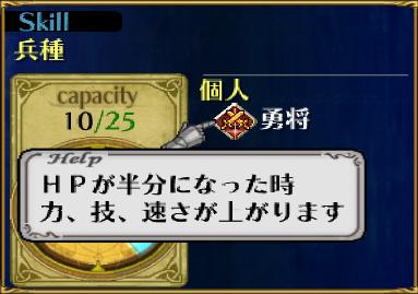 中文描述:当拥有该特技的成员,其HP降到一半以后,其能力值“力”、“技”、“速”会上升原本数值的一半