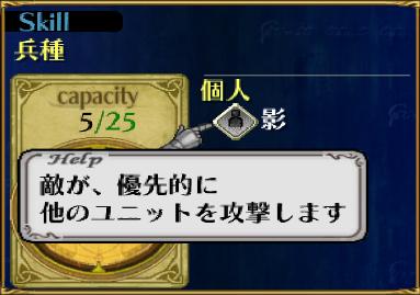 中文描述:拥有该特技的成员,可以使敌人优先攻击他,从而可以避免敌人优先攻击“不希望被敌人攻击”的成员