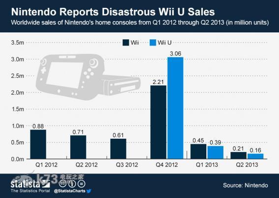 WiiU销量自进入2013年就陷入销售困境,主机销量基本上是每周一小降,每月一大降,而这款主机在过去的2013年上半年甚至还不敌其前任主机Wii在2013年上半年取得的销量成绩。