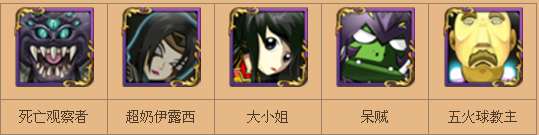 特点:同一列的呆贼和五火球教主联手能够击杀几乎所有英雄,除此之外的三个位置全都是治疗,大小姐和死亡观察者有一定的坦克能力,并且能提供治疗,超奶伊露西在后排的单疗能在回合结束前瞬间拉起受重创的角色。缺点是呆贼、五火球教主和超奶伊露西都比较害怕被秒,否则极其恶心的队伍。