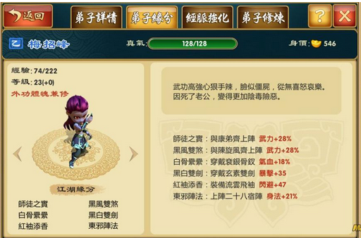 ▲ 透过弟子「缘份」来规划其他弟子的搭配、甚至该使用哪些装备与武学,来取得额外的属性强化,可说是最聪明的培育策略。