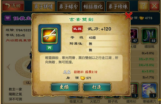 弟子的能力强化,无论练功升级、弟子修炼或是装备的打造,目的都在于「属性」的强化。不过「属性」强化的方向,最重要还是在于弟子本身的特性,从前面提到的「弟子特性」,可以决定弟子首要重点的强化属性。例如:外功卓越的「花完美」,在属性强化的重点,就会放在「武力」上头,而且最好是将这项属于强化到「极致」后,再去考量搭配其他能力的强化,如此一来才能将游戏中有限的资源用在「刀口」上。