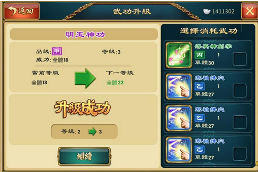 当然,武学与阵法相同,也是可以透过牺牲掉不需要的武学来进行指定武学的升级,不过武学升级也是有一定成功率的,建议大家升级武学时,不要一次丢太多武学来消耗,一次一本来试会是比较务实的做法。