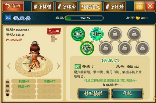 随着弟子的升级,也会陆续开放「经脉强化」所能强化的穴位,这些穴位可以透过消耗不需要的弟子与魂魄来提升穴位的等级,针对对应能力进行大幅强化。不过在特别注意的是,弟子的经脉穴位不见得每一项开放的属性强化都是符合弟子自身特性的,这时候我们也可以透过「洗髓丹」来进行「经脉置换」,但「经脉置换」后,原有的强化就会被洗白,因此在进行经脉强化前,得要先考量是否适合弟子的特性后,再下决定才不会造成资源的浪费。