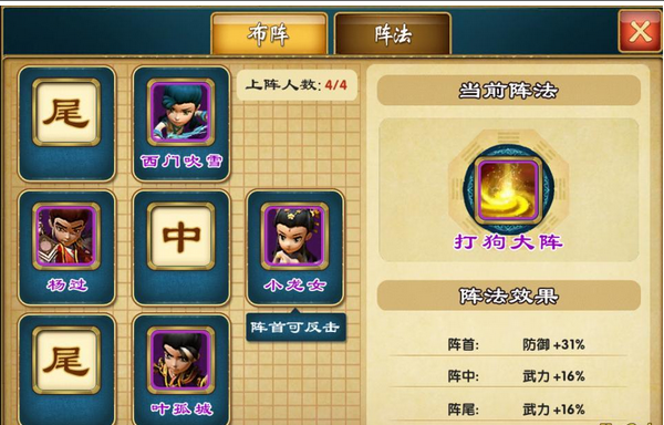 虽然「打狗大阵」的阵法在阵首的部份还是著重在防御能力,但实际上对于阵中的主要伤害输出的中后排,都有相当大的武力强化增幅,在战力提升上非常显著。