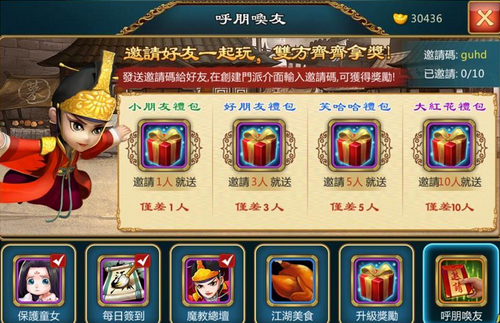 在「武林Q 传」的「奇遇」中,「呼朋唤友」其实就是透过「邀请码」来邀请朋友加入游戏的机制,只要能够邀请到更多好友加入游戏,系统所能提供的「礼包」奖励也会愈丰富呢!赶紧多拉一些朋友到「武林Q 传」当大侠吧!