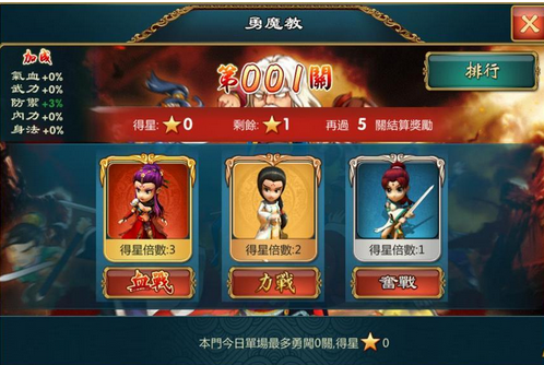 在「奇遇」中的「魔教总坛」是唯一的「闯关型」的任务,每天都有固定的场次可以让我们来挑战关卡,只要战斗不失败,我们可以一直累积挑战的关卡数目,同时累积每次闯关的星等。若是对自己的实力有信心,不妨可以选择星等「倍数」更高的「力战」与「血战」,更能强化我们取得星等的效率哦!