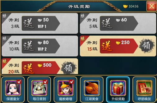 在「武林Q 传」的「奇遇」中,「升级奖励」是鼓励玩家努力升级的一个机制,只要玩家能升上3 级、5 级10 级15 级与20 级时,就有免费的元宝可以拿哦!到达奖励标准等级的朋友,奖励可就千万别客气啦!