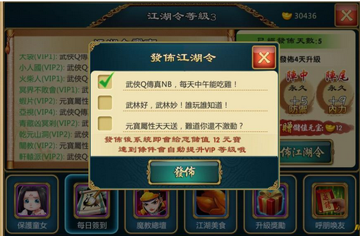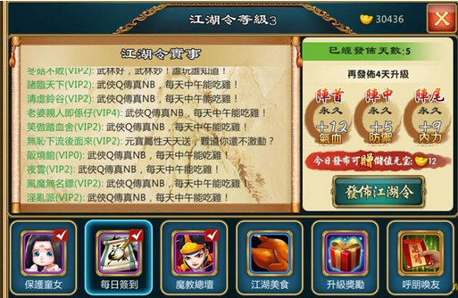 什么?「每日签到」也能拿奖励?别怀疑,「武林Q 传」就是一个这么大方的游戏!每日固定到「奇遇」中的「每日签到」发布「江湖令」,就可以获得额外的元宝奖励,而且只要能完成多日的江湖令发布,还能「永久」提升阵型不同位置的能力哦!
