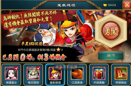 ▲ 「魔教总坛」是「武林Q 传」中唯一的「闯关型」任务,每天都有固定的挑战场次可以让我们累积「星等」来换取奖励。