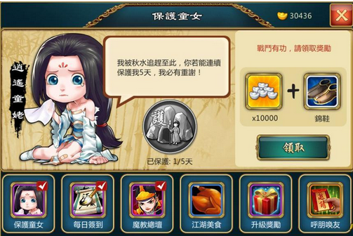 「保护童女」是「武林Q 传」中「奇遇」的一个周期性任务,故事背景大家应该都很熟悉,我们最主要的任务就是需要定期为童姥驱赶追捕的匪徒,这些驱赶任务 一定时间内就会刷新一次,每一次驱赶都是一次战斗,战斗后除了大量的银两奖励之外,也会随机附加装备或是秘笈在奖励品中,对玩家来说是个非常不错的固定收益。当然,除了定期的驱赶任务 之外,如果我们能够固定完成这些驱赶任务 连续5 日,还得额外取得一笔奖励,所以大家三不五时都要记得到奇遇来检查一下「保护童女」的任务